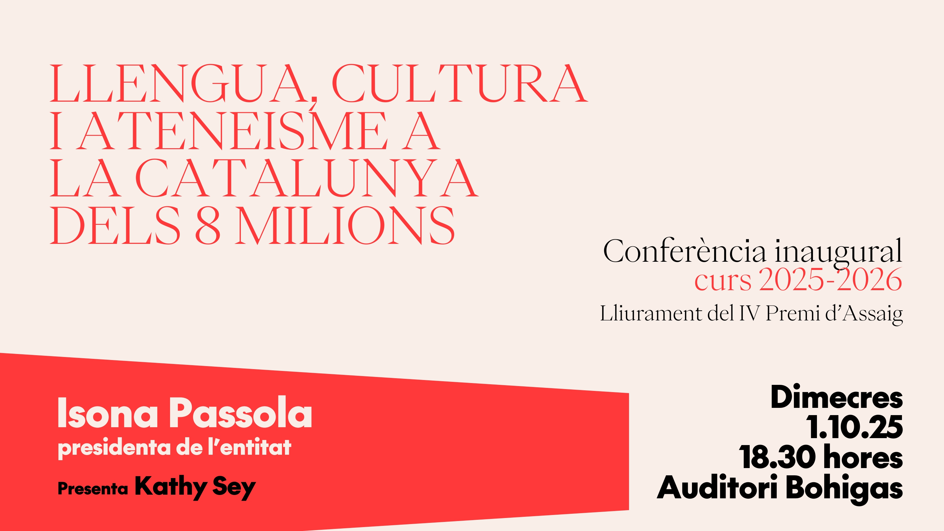 L’Ateneu Barcelonès donarà inici al nou curs amb la conferència inaugural a càrrec de la seva presidenta, Isona Passola, que parlarà sota el títol ‘Llengua, cultura i ateneisme a la Catalunya dels vuit milions’. La seva intervenció obrirà un curs que vol posar l’accent en el paper cabdal de la llengua i la cultura com a eixos de cohesió i projecció de la societat catalana, així com en la vigència de l’ateneisme com a espai de debat, reflexió i convivència.